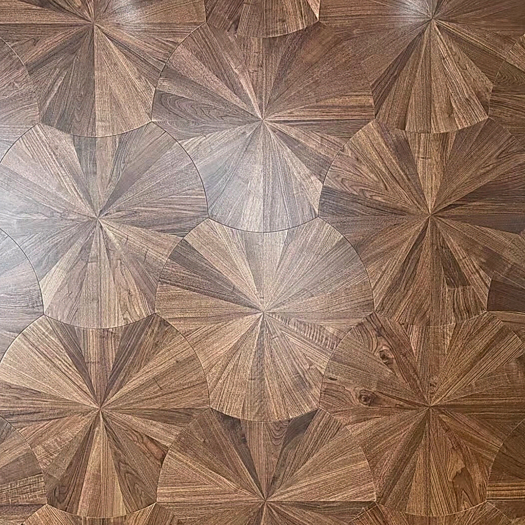 American black walnut flooring is renowned for its stunning, rich colour and natural grain. With the lotus geometric pattern, it offers a unique and refined design for both contemporary and classic interiors. The bespoke nature of this flooring allows it to adapt to any colour or finish, making it the perfect choice for high-end design projects.