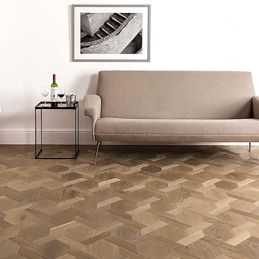 Enhance your interiors with our Mansion Weave Geometric Parquet Unfinished Oak Flooring. This engineered oak parquet features a unique geometric pattern, brushed and unfinished for a customisable finish. With micro-bevelled edges and a tongue and groove profile, it’s designed for easy installation and is compatible with underfloor heating systems. Ideal for high-traffic areas, this classic-grade oak flooring adds timeless elegance to any space.