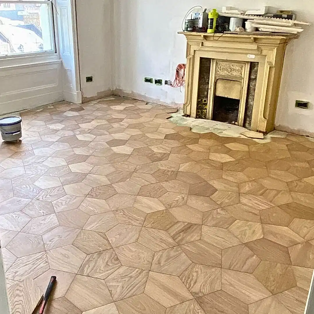 The Pentagon Crown Geometric Parquet is a striking flooring choice, designed to bring architectural beauty and sophistication to any interior. Featuring a bold pentagon crown pattern, this engineered oak parquet enhances both modern and traditional spaces with its intricate design and premium craftsmanship.
