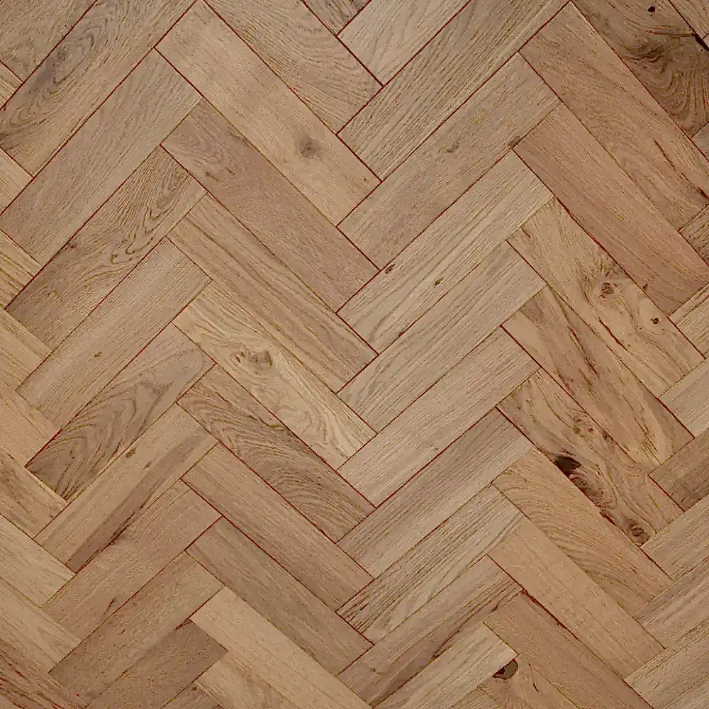The Solid Oak Parquet Natural combines a brushed surface with a matt lacquer seal in 90 × 18 × 300 mm solid oak planks. The light texture enhances grain visibility, while the matt finish adds subdued elegance and durability.